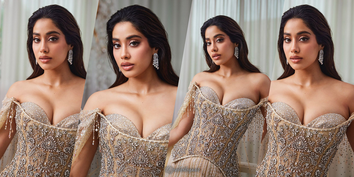 Complementing her stunning gown, Janhvi opted for minimal yet elegant accessories. She wore a pair of statement earrings that perfectly matched the sparkle of her dress, adding a hint of glamour without overshadowing the intricate details of her outfit. Her makeup was flawlessly executed, with a soft, dewy look that emphasized her natural beauty. Subtle eyeshadow, winged eyeliner, and a nude lip color enhanced her features, while her voluminous, wavy hair framed her face perfectly, adding to the overall allure of her look.