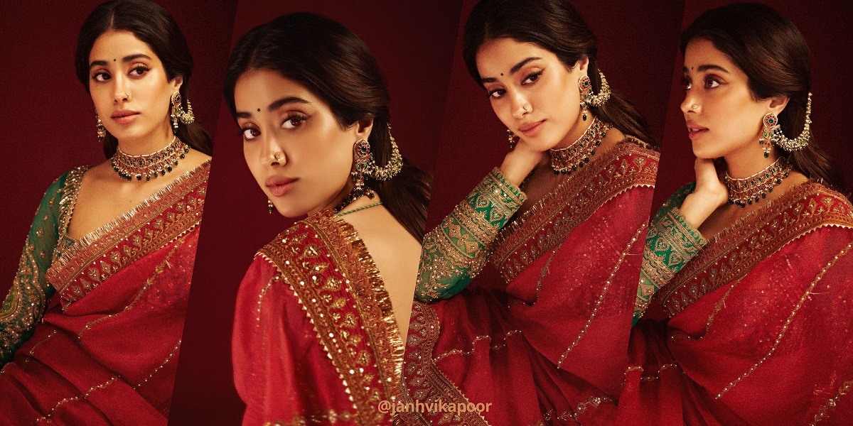 Janhvi Kapoor in a Regal Red Saree with Green Blouse and Intricate Gold Embellishments